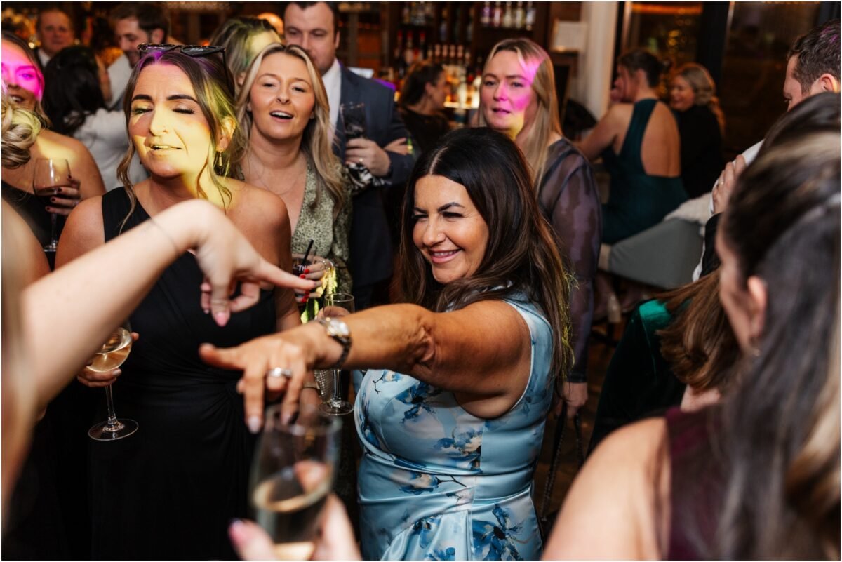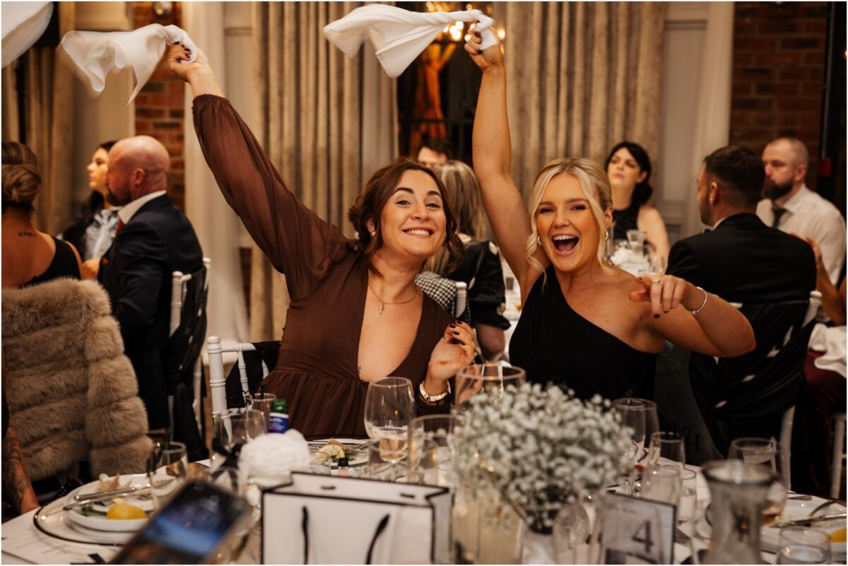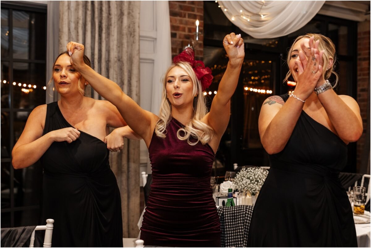 The wedding breakfast turned into one of the highlights of the day. Paul Guard performed live while guests ate. The room quickly filled with energy. People were on their feet, swinging napkins and weaving through tables in a conga.